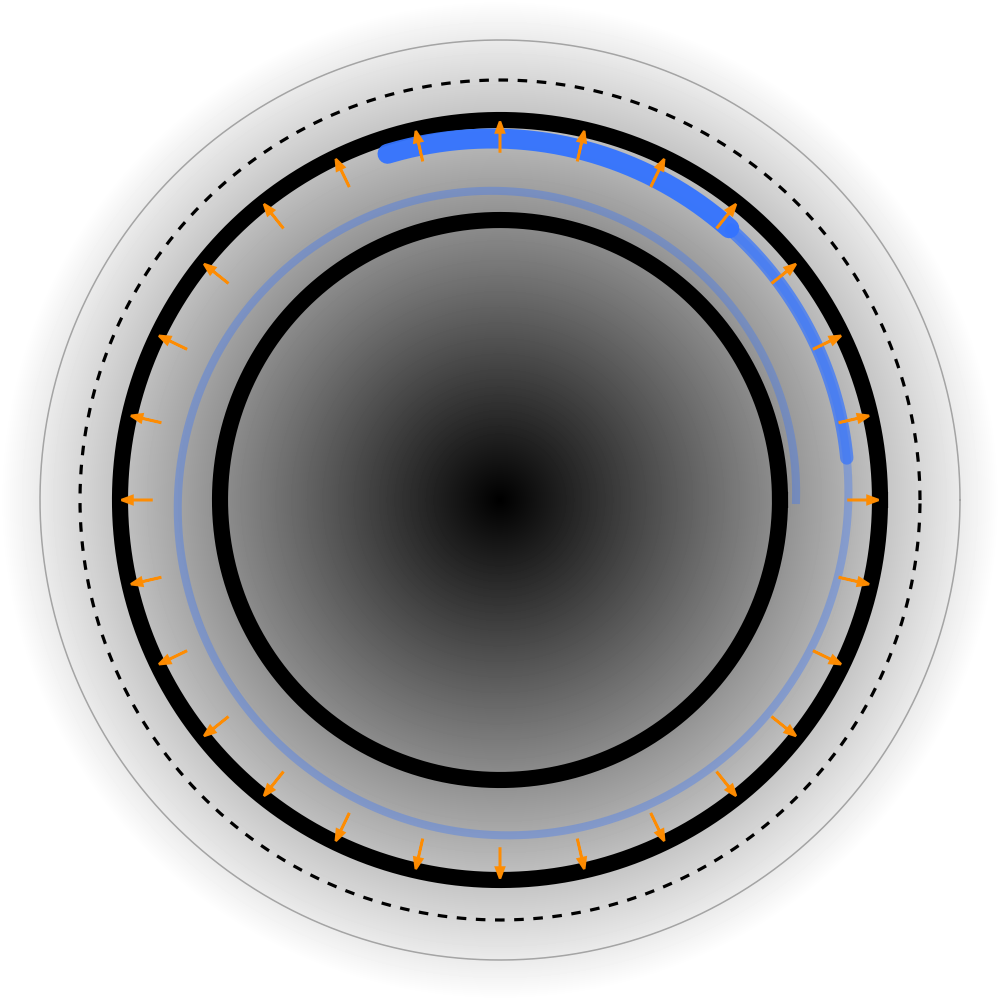 - עטרת חצים קצרים בצבע כתום מעט מחוץ לטבעת הפונים פנימה. במיקרו ההתנגדות קטנה עם כיוון החצים וגדולה נגדם וזה מקור המשיכה והדחייה.