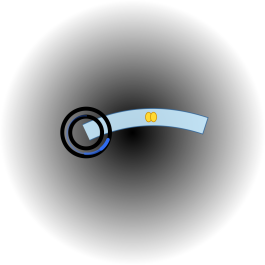 מימין מופיע טבעת כפולה קטנה המסמנת את הגרעין שהוא מרכז נושא־עצמו בעל עובי. לשמאל נמשכת קשת תכלת שהיא תעלת צבע, רצועת כליאה מכוח מתח ולא צינור חומרי.