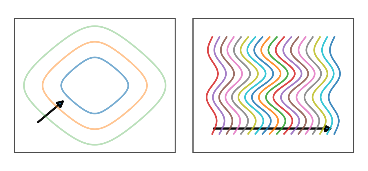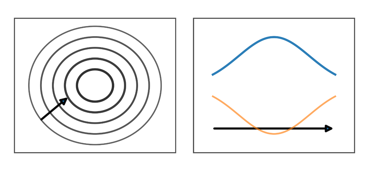 - תחילה משתנה הנוף ורק אז מתגלה הכוח: בוא החבילה מקשיח או מרפה מעט את המתח המקומי; המדרון משתנה והחלקיק נסחף נטו אל הכיוון ה“חלק” יותר — תחושת משיכה או דחיפה.