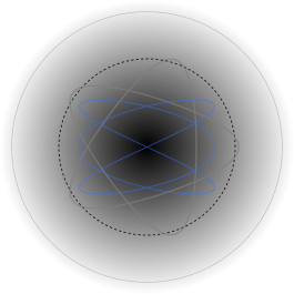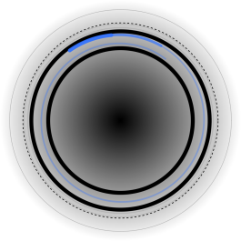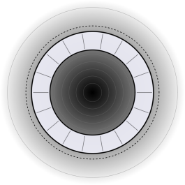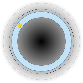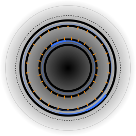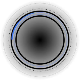 תרשים – רמזים: טבעת שחורה כפולה ועבה, בתוכה ספירלה כחולה כסימון החזית. אין חיצים כתומים. מחוץ לטבעת כרית נקודתית לאזור מעבר וקווים דקים כהפניה לשדה הרחוק.