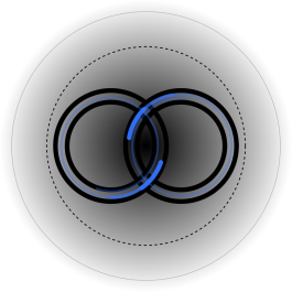 תרשים – רמזים: שתי טבעות כפולות משולבות זו בזו, ספירלה כחולה על כל אחת. ניטרלי וללא חיצים חשמליים. כרית נקודתית מקיפה.