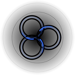 תרשים – רמזים: שלוש טבעות כפולות בסידור משולש עם חפיפות מלפנים ומאחור לשם המחשת השזירה. ספירלות כחולות, ללא חיצים חשמליים. מחוץ למבנה אזור נקודתי ורמז לטבעת ייחוס בשדה הרחוק.